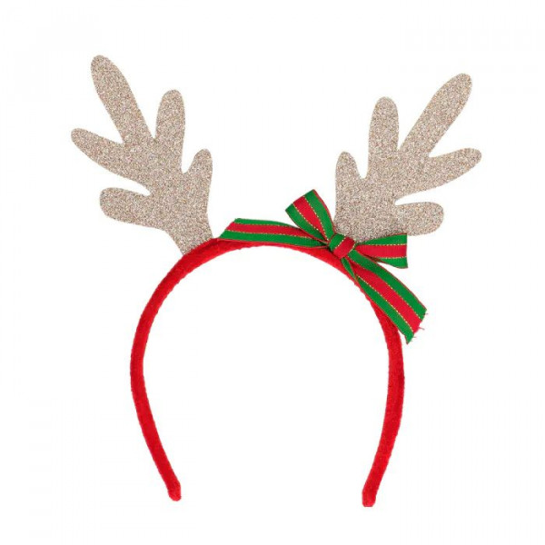 The antlers are made of gold glittering stiffened sponge- type material. The bow features green and red stripes with golden accents.